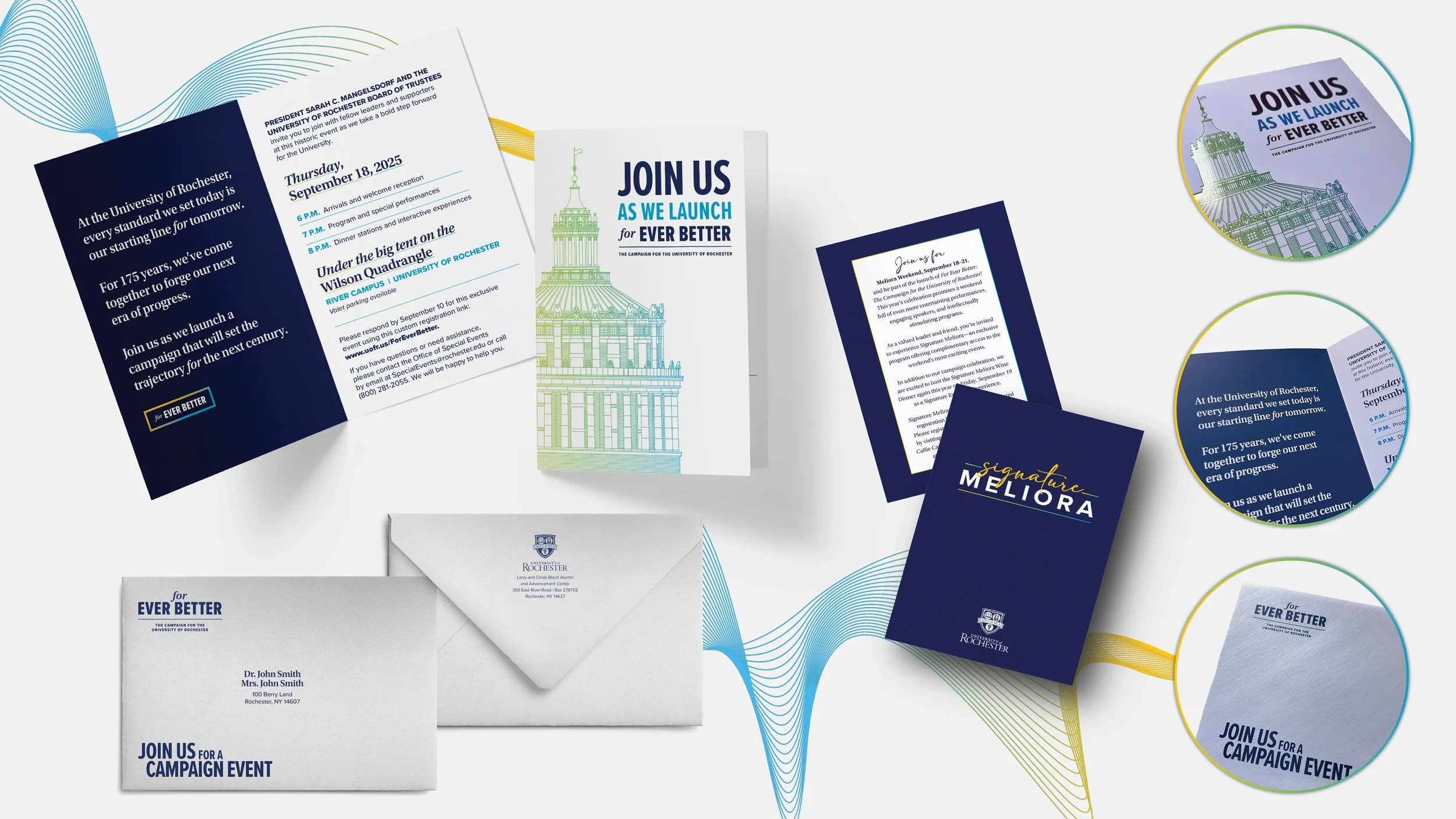 On September 18, 2025 the University launched For Ever Better: A Campaign for the University and Rochester. This era was ushered in with a celebratory launch event during the University’s annual Meliora Weekend. Working in partnership with August Jackson, the creative + special events teams were tasked with crafting an experience to showcase the impact of the last 175 of University philanthropy while engaging and exciting attendees about a future of the University of Rochester.